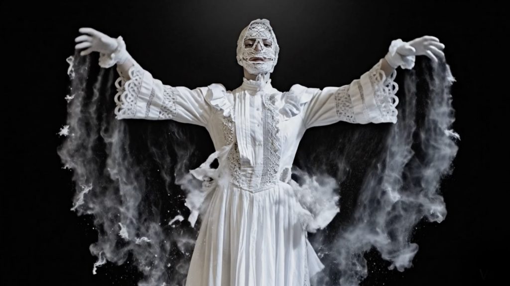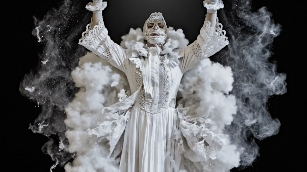 The space remains inhabited by dramatic material even after the actors leave the stage. The viewer is not confronted with an explanation, but with a feeling they carry away with them. In this way, the theatrical material shifts from the narrative level into a material and sensory experience, where the projection does not repeat the meaning of the performance, but functions as its echo within the space.